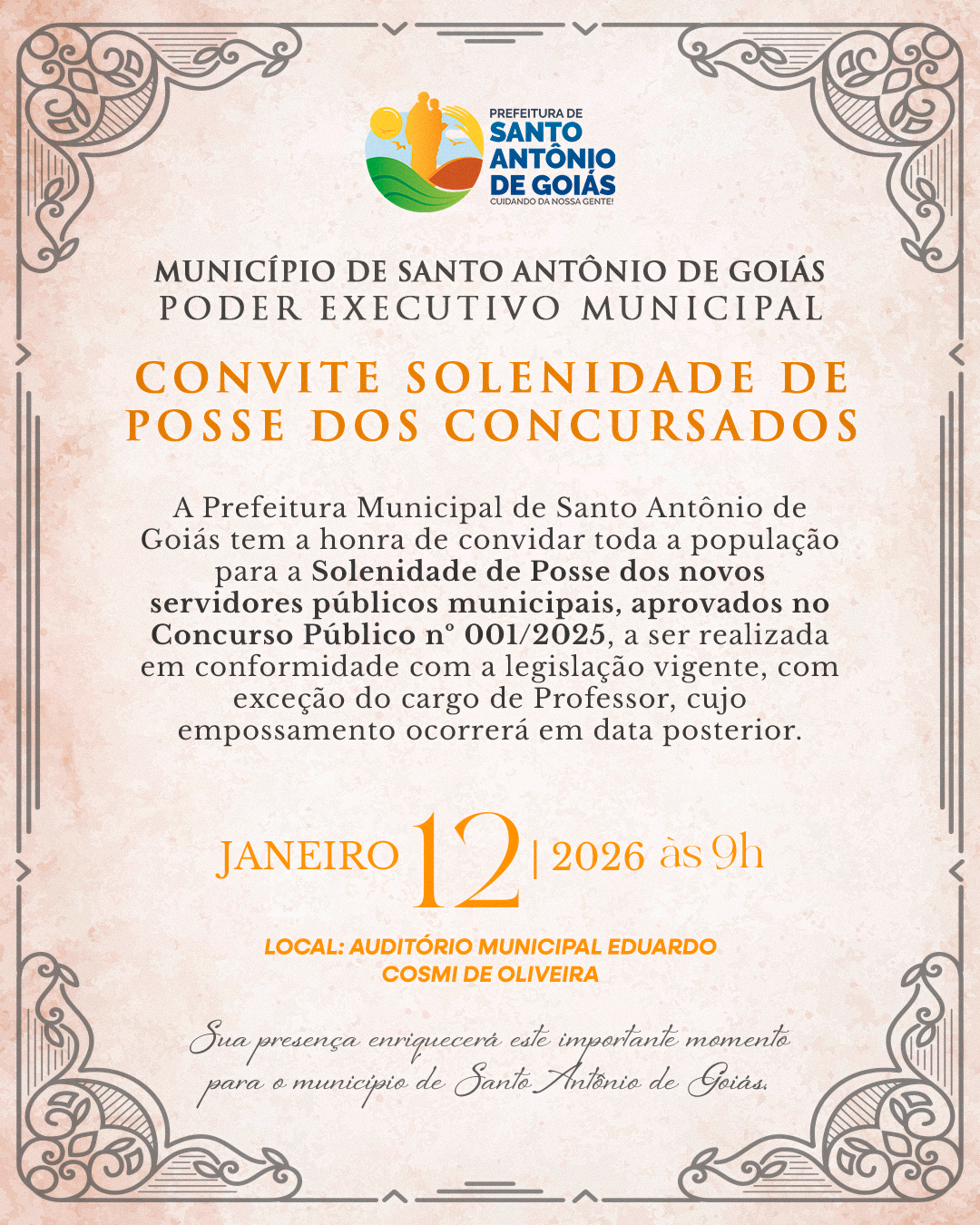 A Prefeitura Municipal de Santo Antônio de Goiás realiza, na próxima segunda-feira, dia 12 de janeiro, às 9 horas, no Auditório Municipal Eduardo Cosmi de Oliveira, a Solenidade de Posse dos novos servidores públicos municipais, aprovados em Concurso Público, em conformidade com a legislação vigente.